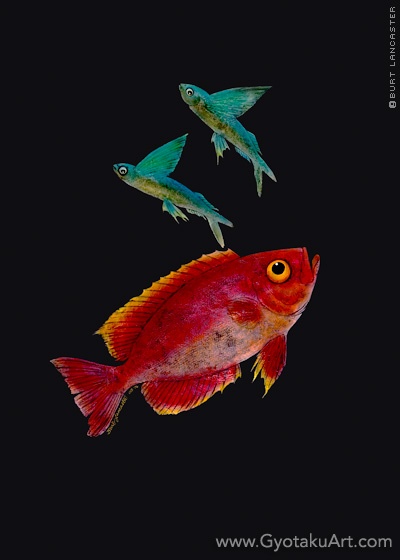 Description: Single big eye and two flying fish on a black background. Original is already framed.